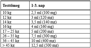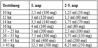 - 3 napos kezelés: naponta egyszer 12,5 ml (500 mg)